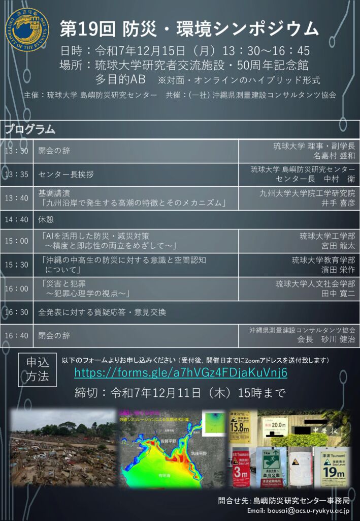 講演会・イベント情報Information about Lectures and Events 2024年11月27日 「第18回 防災・環境シンポジウム」を開催します 2024年9月13日 2015.02.17 島嶼防災センター主催 「2014年ノーベル物理学賞受賞者 天野浩先生 特別講演会」を開催しました 2024年3月8日 緊急報告会 令和6年年能登半島地震災害の教訓ー沖縄県への提言 を開催いたします